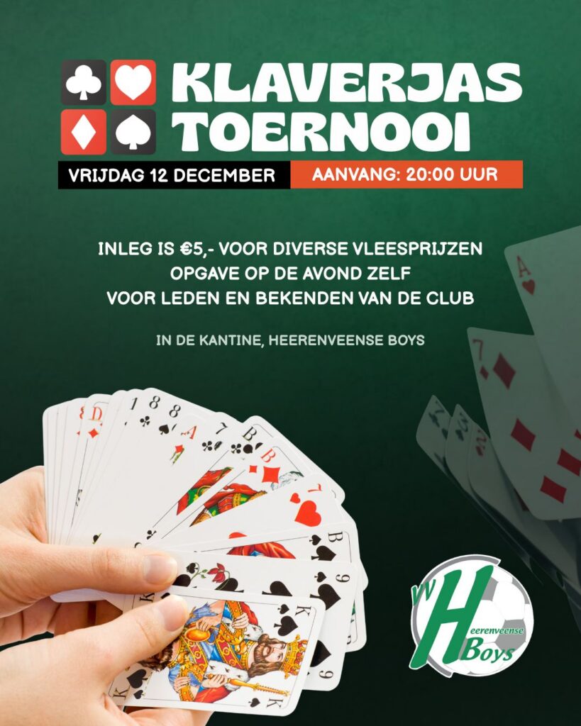 Op vrijdag 12 december 2025 zal in onze kantine weer de gelegenheid zijn om te klaverjassen. Om 20:00 uur zal de avond beginnen in onze kantine. Om mee te doen aan dit bekende kaart spel kunt u zich op de avond zelf opgeven. De inleg is €5,- en dan maakt u kans op heerlijke vleesprijzen. De opgave van deze klaverjas avond is voor alleen leden en bekenden van de club Heerenveense Boys. Voor alle kaart liefhebbers is dit een avond die je niet wilt missen. Kom langs op 12 december en neem deel aan een avondje Klaverjassen!